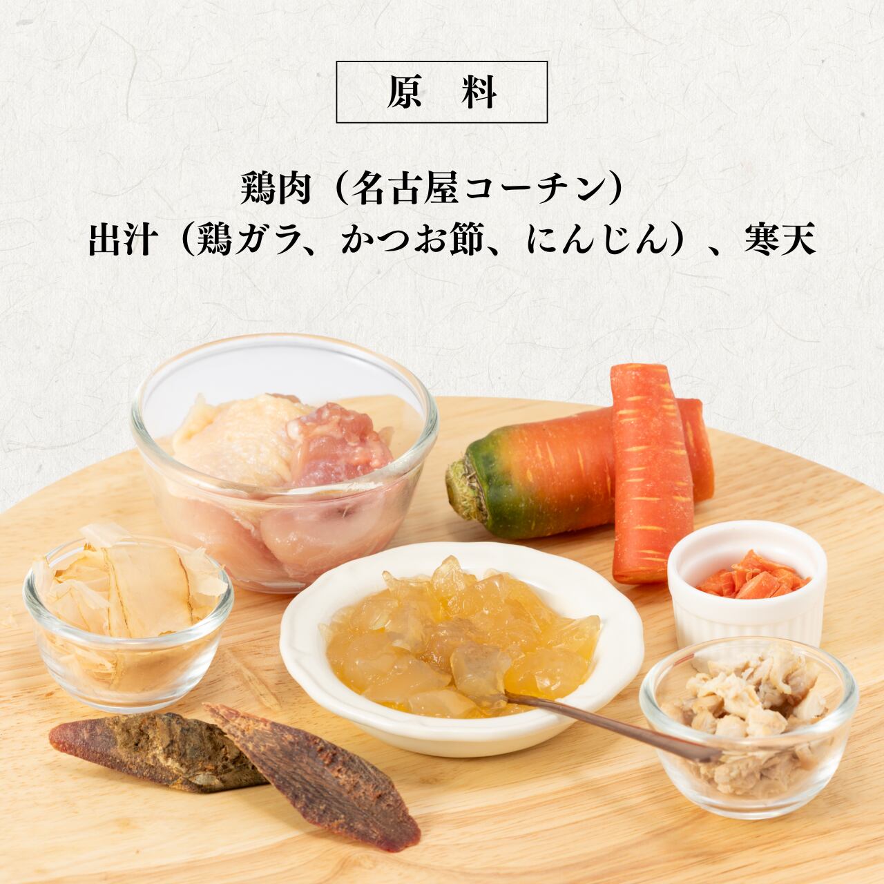 ◼︎原料:鶏肉(名古屋コーチン)、出汁(鶏ガラ、かつお節、にんじん)、寒天